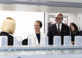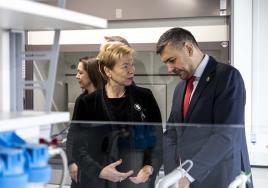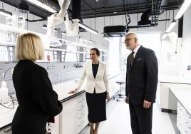 RSU rektors prof. Aigars Pētersons un Farmācijas fakultātes dekāne prof. Dace Bandere (no kreisās) izrāda veselības ministrei Līgai Meņģelsonei Farmācijas studiju un pētniecības centra telpas