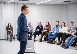 Pedagoģiskās izaugsmes inovāciju vadītājs Raimonds Strods uzrunā Jauno docētāju skolas dalībniekus noslēguma pasākuma laikā