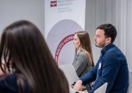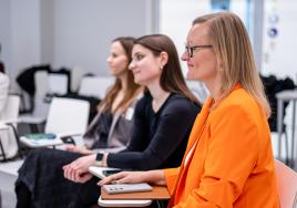 Pedagoģiskās izaugsmes centra direktore asoc. prof. Nora Jansone-Ratinika (no labās) piedalās Jauno docētāju skolas noslēguma pasākuma laikā