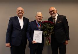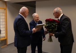 RSU rektors Aigars Pētersons un Senāta priekšsēdētājs Jānis Gardovskis sveic profesoru Romanu Lāci