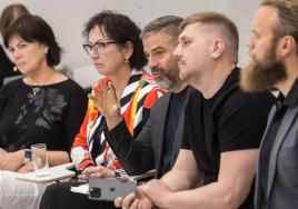 No kreisās: Līga Cīrule, Zinta Zālīte, Gints Kuzņecovs, Vladimirs Šteinbergs, Sergejs Kovaļovs un Dmitrijs Miļkēvičs