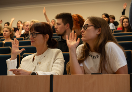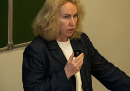 Docētāja Kristiana Jansone uzrunā programmas atklāšanas pasākuma dalībniekus