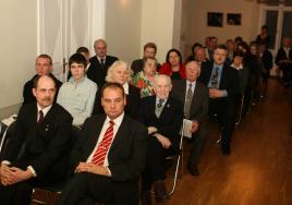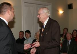 Saeimas priekšsēdētājs Gundars Daudze pasniedz 1991. gada barikāžu dalībnieka Piemiņas zīmi docentam Agnim Štiftam
