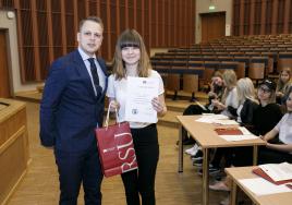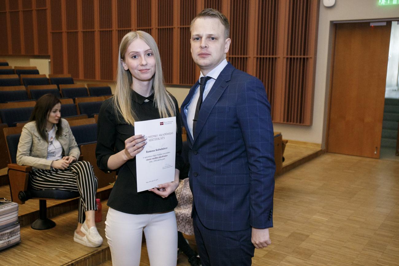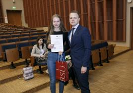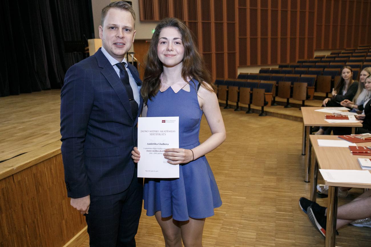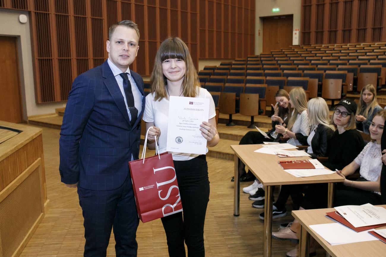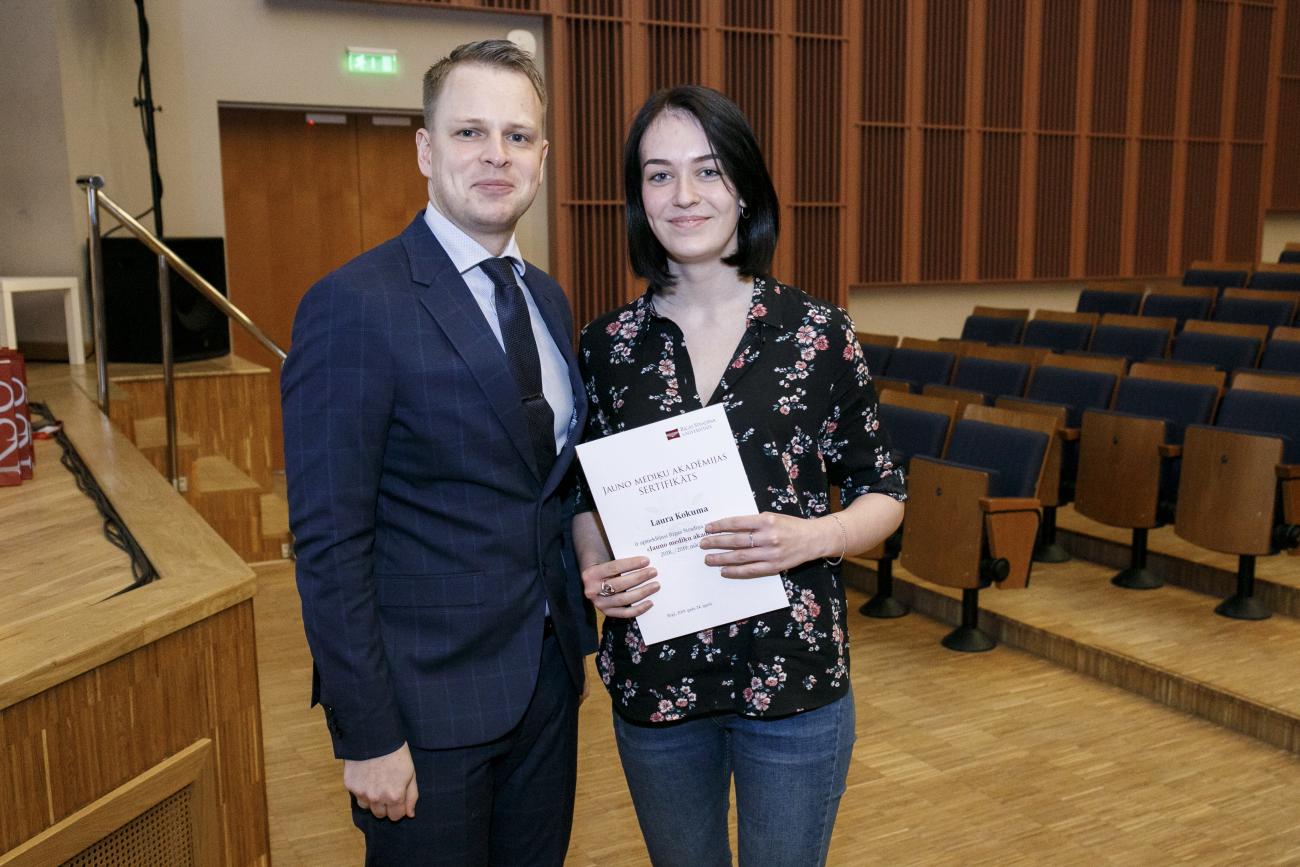 Erudīcijas konkursa uzvarētāja Laura Kokuma no Valmieras Valsts ģimnāzijas kopā ar doc. Ingu Skadiņu