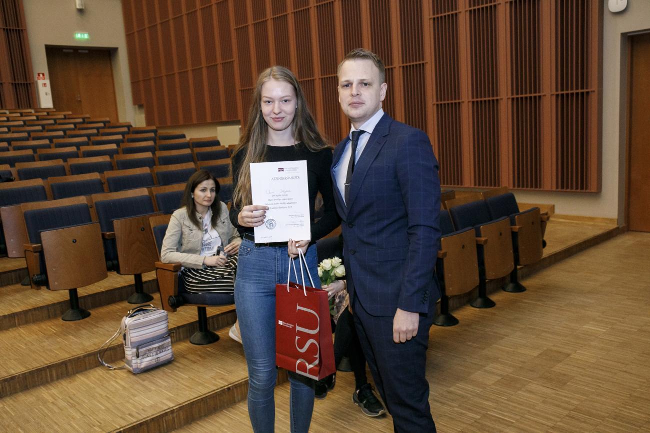 Erudīcijas konkursa otrās vietas ieguvēja Andželika Gladkova no Valmieras Valsts ģimnāzijas kopā ar doc. Ingu Skadiņu