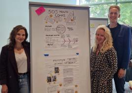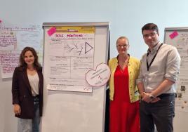 Evita Grigoroviča (no kreisās), Nora Jansone-Ratinika un Matīss Sīlis prezentē prasmju monitoringa sistēmu