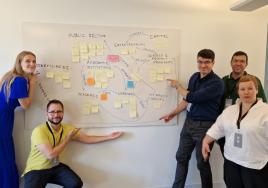 Evita Grigoroviča (no kreisās), Lāsma Šķestere un Raimonds Strods prezentē simulācijas spēli krīzes komunikācijā