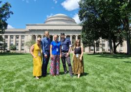 Lāsma Šķestere (no kreisās), Raimonds Strods, Nora Jansone-Ratinika, Matīss Sīlis un Evita Grigoroviča pie Masačūsetsas Tehnoloģiju institūta