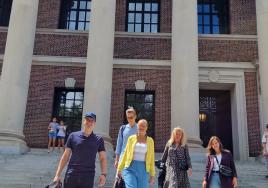 Harija Elkinsa Vaidnera memoriālā bibliotēkā (The Harry Elkins Widener Memorial Library), Hārvarda Universitātē. No kreisās: Matīss Sīlis, Nora Jansone-Ratinika, Raimonds Strods, Lāsma Šķestere, Evita Grigoroviča