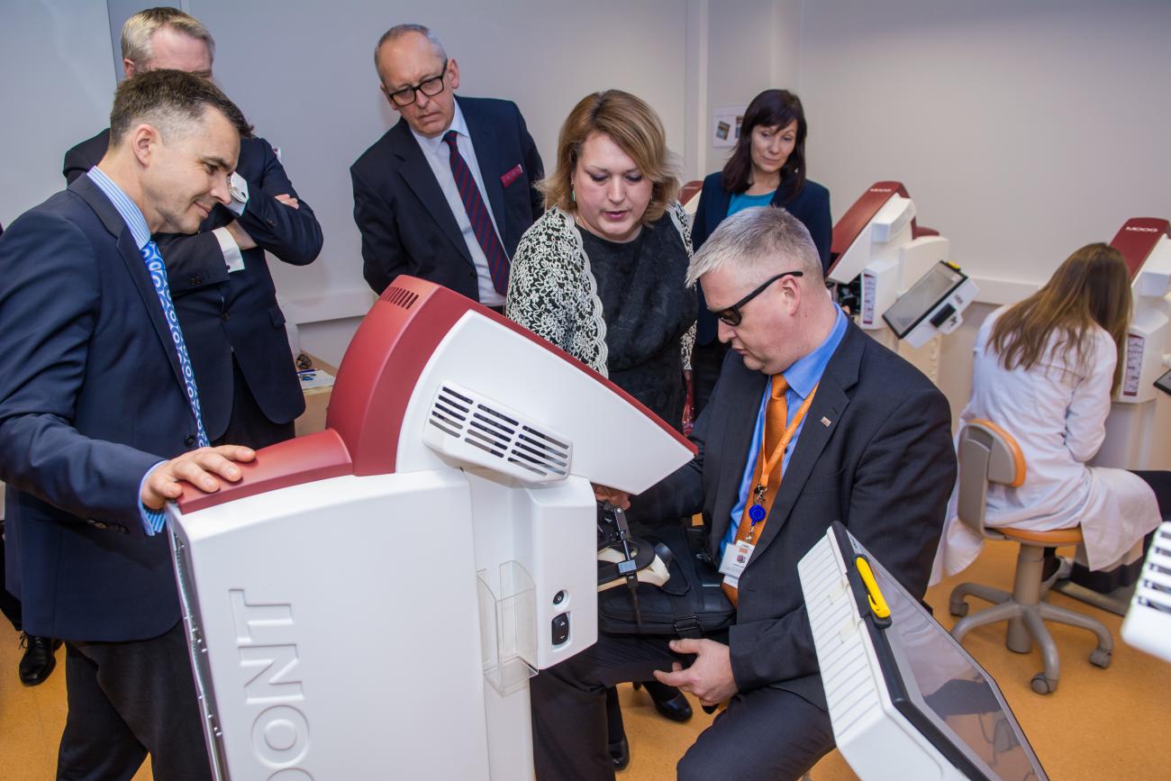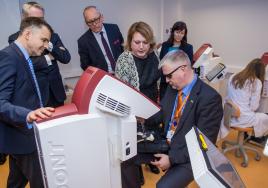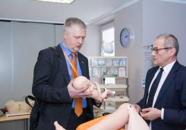 Veselības ministrijas valsts sekretārs Aivars Lapiņš (no kreisās) iepazīst RSU Medicīnas izglītības tehnoloģiju centru