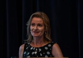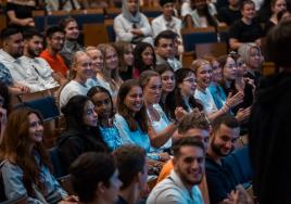 Ārvalstu studentu Iepazīšanās nedēļa. Starptautisko sakaru departamenta direktore Baiba Pētersone uzrunā jaunos ārvalstu studentus