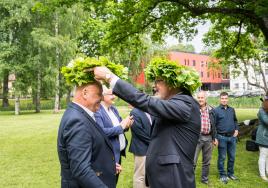 RSU rektors prof. Aigars Pētersons (no labās) un Senāta priekšsēdētājs prof. Jānis Gardovskis piedalās Jāņu ielīgošanā RSU Iedvesmas parkā 2022. gada 21. jūnijā