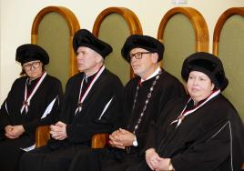 RSU zinātņu prorektore Agrita Kiopa (no kreisās), veselības studiju prorektors prof. Guntis Bahs, rektors prof. Aigars Pētersons un Doktorantūras nodaļas dekāne prof. Sandra Lejniece Doktorantūras nodaļas izlaidumā