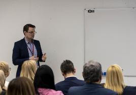 Satura attīstības un pakalpojumu piedāvājuma nodaļas vadītājs Mārtiņš Riekstiņš iepazīstina sanāksmes dalībniekus ar RSU Mūžizglītības centra mācību piedāvājumu un sadarbības iespējām