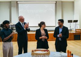 Jubilejas torti griež (no kreisās) ĀSA viceprezidents Jatins Sabu, RSU rektors Aigars Pētersons, ĀSA prezidente Barbara Silva un integrācijas un sporta virziena vadītājas vietnieks Mazēns Mazārs