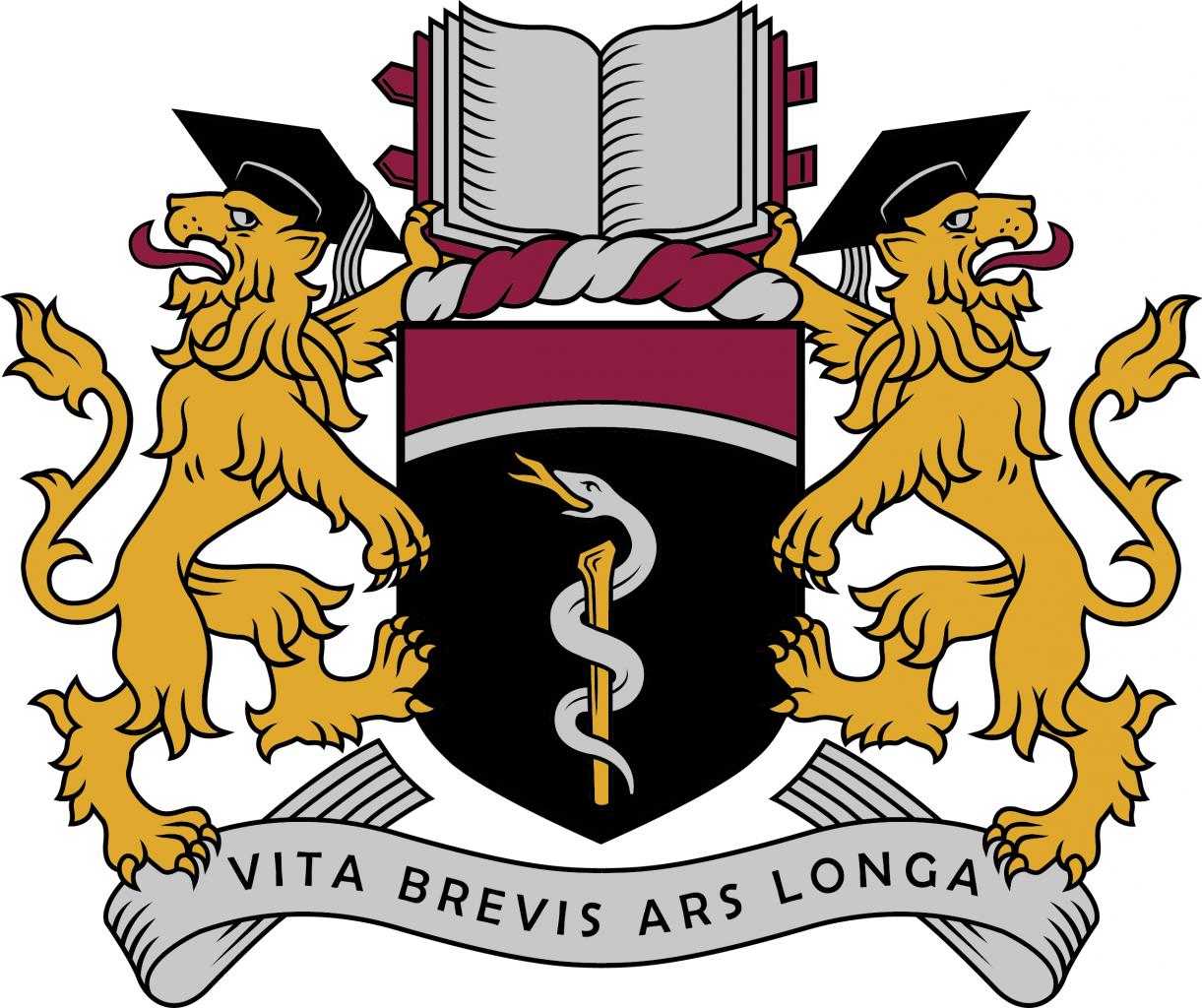 Vairogs dalīts galvā ar izliektu sudraba pavediensiju: purpurs un melns. Apakšējā laukā – zelta Asklēpija zizlis ar tam apvijušos sudraba čūsku ar zelta mēli. Vairogs pārsegts ar sudraba-purpura grīsti. Vairoga turētāji – divi zelta lauvas ar atpakaļvērstu galvu, melnu četrstūrainu akadēmisko cepuri uz tās un purpura mēli, kuri ķetnā – viens labajā, otrs kreisajā – tur arī virs vairoga (kleinodā) atvērtu sudraba grāmatu ar purpura vāku un stāv uz sudraba lentes ar melnu devīzi VITA BREVIS ARS LONGA.