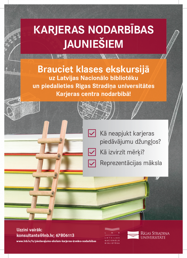 Latvijas Nacionālā bibliotēka sadarbībā ar Rīgas Stradiņa universitātes Karjeras atbalsta un labbūtības centru piedāvā informatīvas un izglītojošas Karjeras nodarbības. Tiek piedāvāts iepazīt visus karjeras plānošanas aspektus. Tostarp pašnovērtējuma veikšanu, darba tirgus izpēti un iepazīšanu, izglītības iestāžu piedāvājumu konkrētas profesijas apguvei, karjeras lēmuma pieņemšanu un citus. Karjeras nodarbības iespējams personalizēt un pielāgot tam, kas interesē jauniešus. Rīgas Stradiņa universitātes Karjeras centrs iespēju robežās piesaista studentus – vēstnešus, kas var informēt skolēnus par konkrētām studijām RSU fakultātēs un par nākotnes profesijas izvēli, kā arī informatīvu stāstu par RSU.