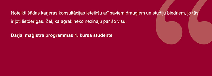 Reizi mēnesī saņemsi e-pastu par Karjeras atbalsta un labbūtības centra aktualitātēm, jaunumiem, gaidāmajiem pasākumiem un semināriem.