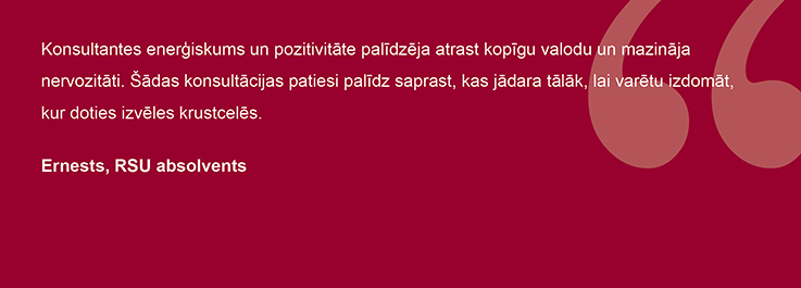 Karjeras atbalsta un labbūtības centrs sniedz atbalstu RSU studentiem, skolēniem un absolventiem dažādos ar profesionālo un karjeras izaugsmi saistītos jautājumos, kā arī sadarbības iespējas darba devējiem. Piedāvājam individuālās un grupu konsultācijas, karjeras nodarbības, tematiskos seminārus un lekcijas.