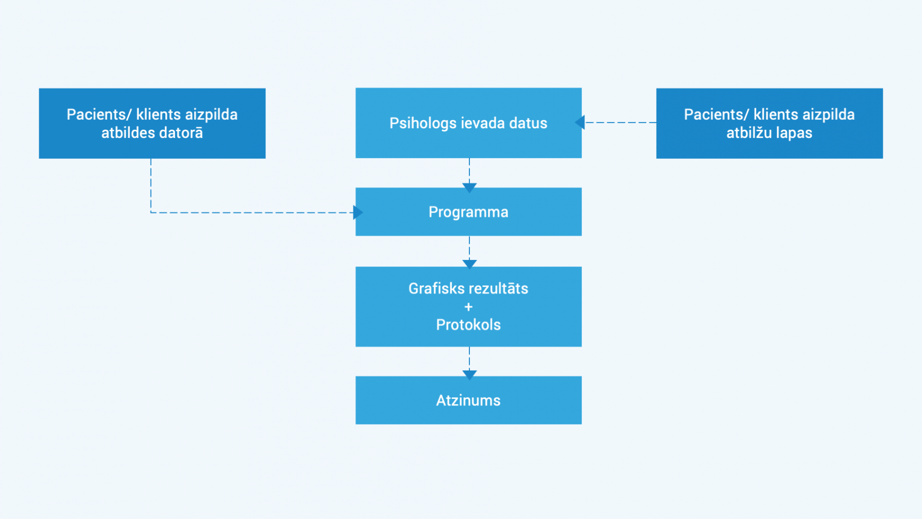 Pēc testa aizpildīšanas elektroniskajā platformā psihologs saņem automātiski izveidotu testa atbilžu protokolu un klienta vai pacienta profilu grafiski uzskatāmā veidā, kas atvieglo atzinuma sastādīšanu un dokumentēšanu.
