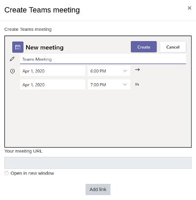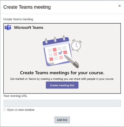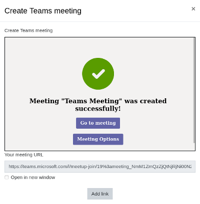 5. Saite tiks rādīta laukā Jūsu sapulces URL (angliski - Your meeting URL). Atzīmējiet “Atvērt jaunā logā” (angliski - Open in a new window), ja vēlaties, lai sapulce tiktu atvērta jaunā cilnē, un noklikšķiniet uz Pievienot saiti (angliski - Add link), lai pabeigtu.
