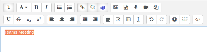6. Lai nokļūtu uz sapulces opcijām, atlasiet tekstu ar iepriekš izveidoto sapulces saiti un rīkjoslā Atto redaktors noklikšķiniet uz ikonas Microsoft Teams.