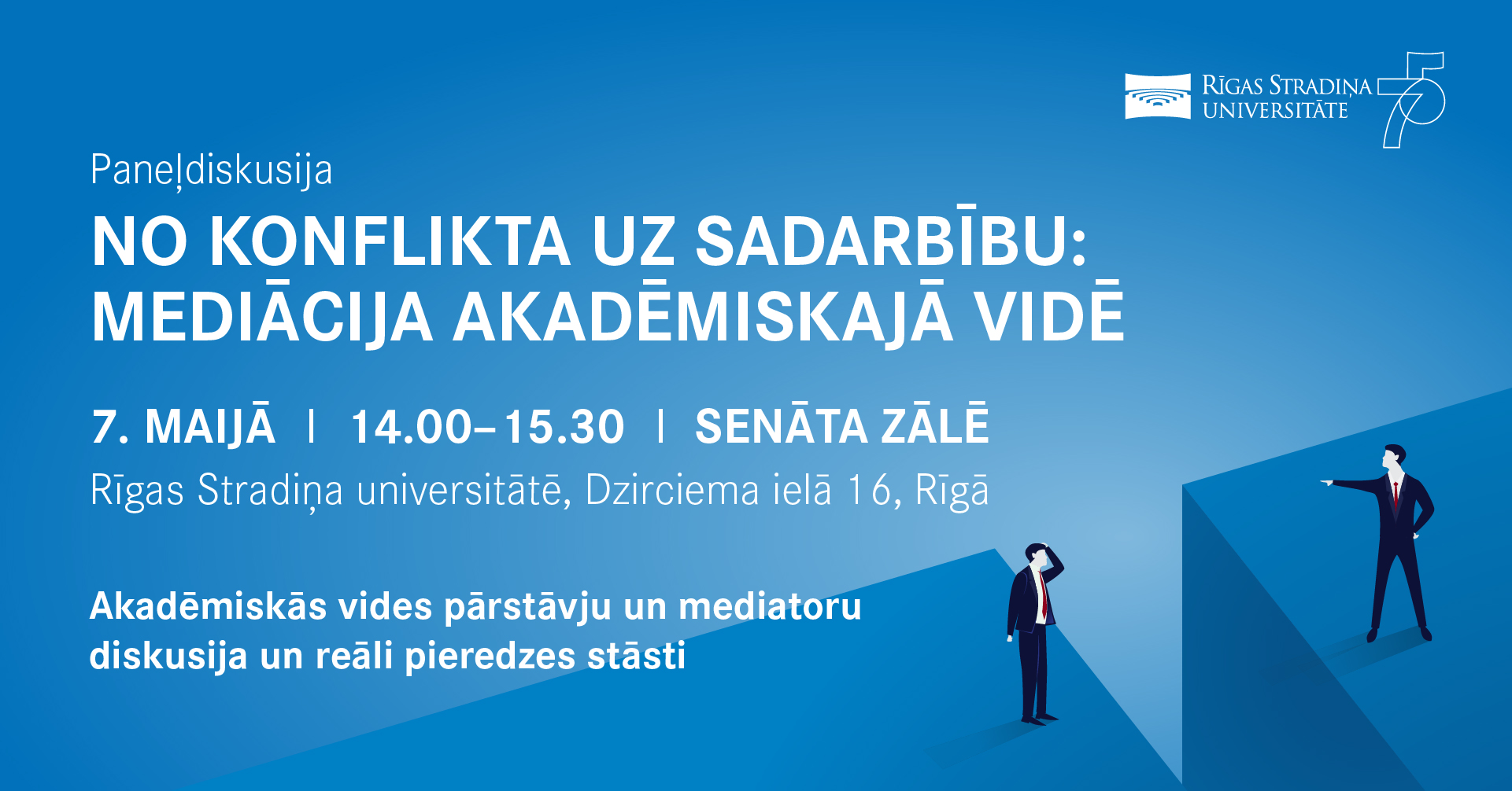Rīgas Stradiņa universitātē norisināsies paneļdiskusija par mediācijas lomu un iespējām akadēmiskajā vidē. Eksperti no dažādām izglītības un juridiskajām institūcijām diskutēs par mediācijas būtību, tās pielietojumu starp studentiem, mācībspēkiem un vadību, kā arī normatīvo regulējumu un institucionālā atbalsta nepieciešamību. Dalībnieki dalīsies pieredzē par mediācijas ieguvumiem un izaicinājumiem, kā arī apspriedīs tās ieviešanas perspektīvas akadēmiskajā vidē. Pasākuma mērķis ir veicināt dialogu un rast efektīvus risinājumus konfliktu pārvaldībai izglītības iestādēs.