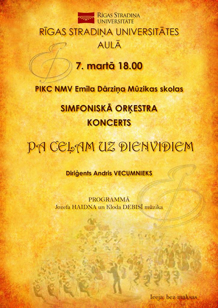 Trešdien, 7. martā, pulksten 18.00 Rīgas Stradiņa universitātes aulā būs iespēja dzirdēt PIKC NMV Emīla Dārziņa Mūzikas skolas simfoniskā orķestra koncertu Pa ceļam uz dienvidiem diriģenta Andra Vecumnieka vadībā.