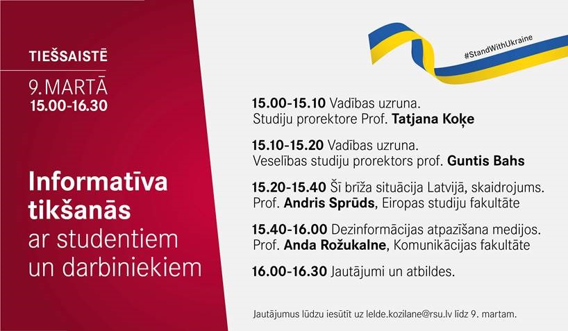 Tikšanās Zoom saite būs pieejama studentiem un darbiniekiem e-pastā.Telpatiešsaistē, Zoom platformāDatums: 09.03.2022. Kontaktinformācija Agnese LielāE-pasts: agnese.liela [at] rsu.lv
