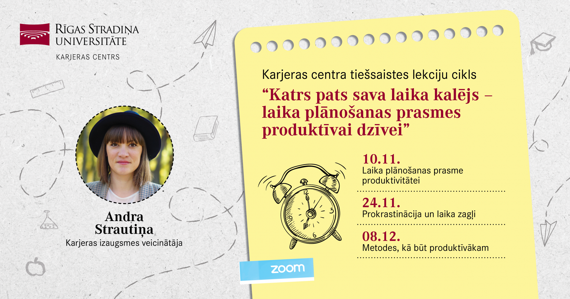 Ja tev regulāri pietrūkst pāris stundas diennaktī, lai paspētu visu, ko esi ieplānojis, vai tu regulāri kavē sapulces vai lekcijas, un tāpēc tava ikdiena kļūst arvien stresaināka, RSU Karjeras centrs piedāvā trīs nodarbību ciklu Katrs pats sava laika kalējs – laika plānošanas prasmes produktīvai dzīvei. Tas būs veltīts laika plānošanas prasmēm, kuras būs noderīgas produktīvākai darbībai.