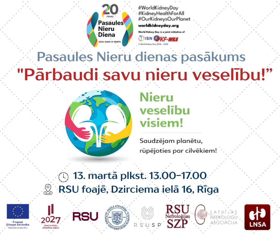 2026. gada 13. martā no plkst. 13 līdz 17 RSU galvenās ēkas foajē (Dzirciema ielā 16) ikviens aicināts piedalīties pasākumā Pārbaudi savu nieru veselību!.