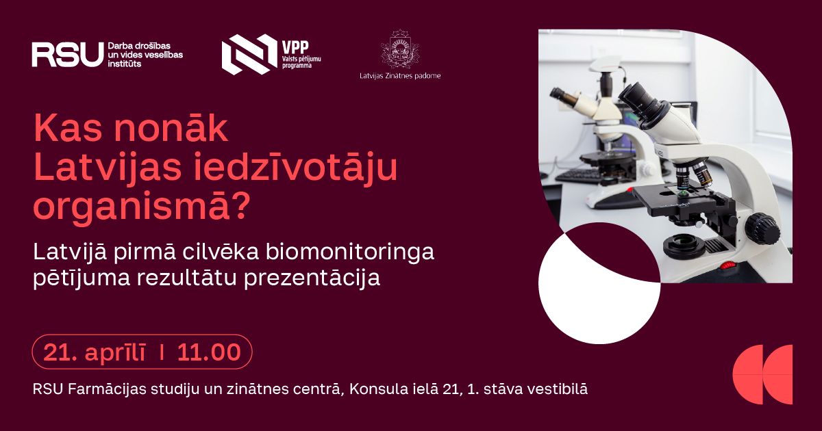 2026. gada 21. aprīlī plkst. 11 Rīgas Stradiņa universitātes (RSU) Farmācijas studiju un pētniecības centrā (Konsula ielā 21) notiks cilvēka biomonitoringa pētījuma rezultātu prezentācija. Pasākumu varēs vērot tiešraidē.
