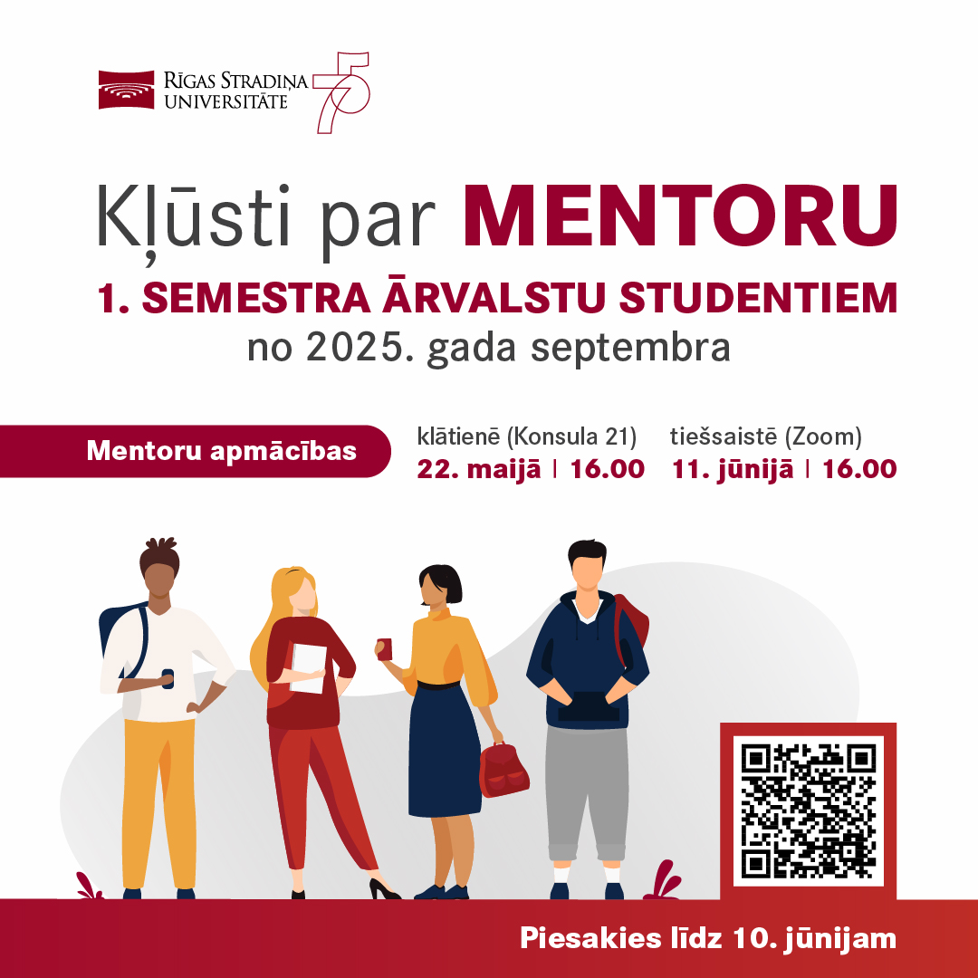 Rīgas Stradiņa universitātes (RSU) Starptautisko sakaru departaments aicina studentus kļūt par mentoriem pirmā semestra ārvalstu studentiem, kuri sāks studijas RSU 2025. gada septembrī.