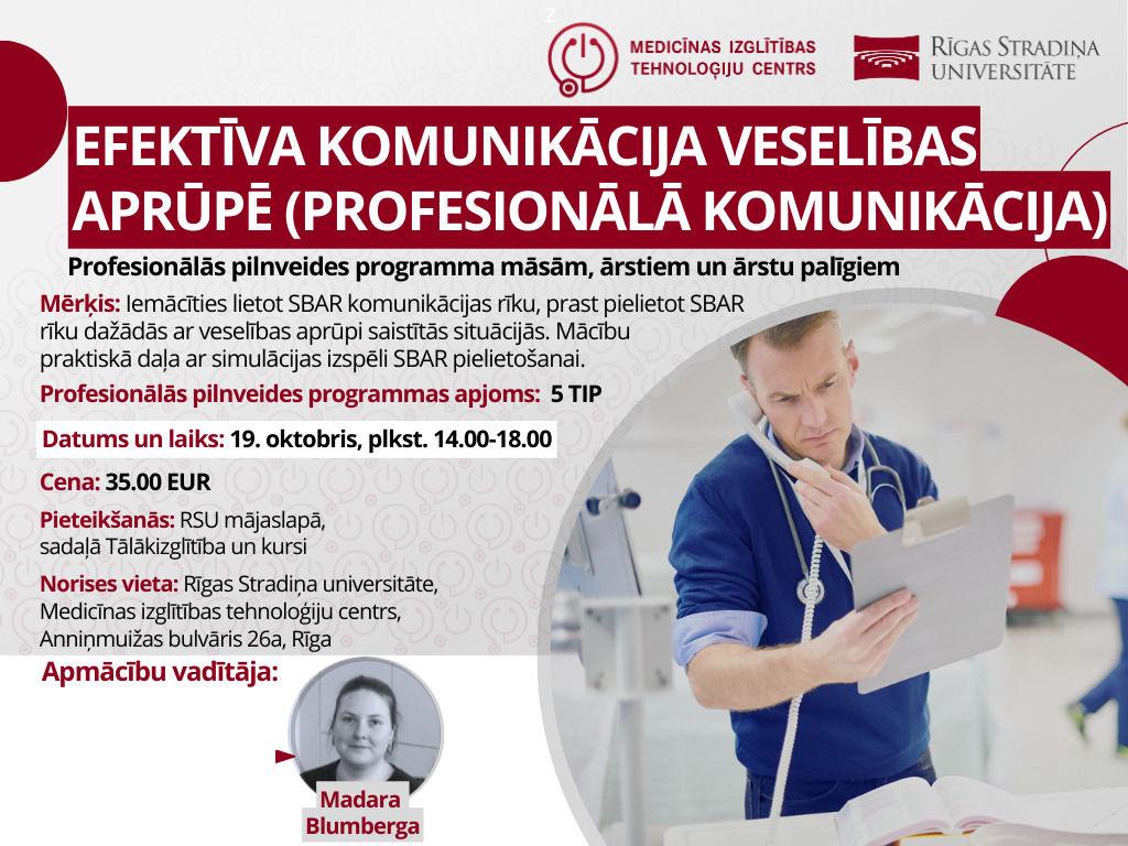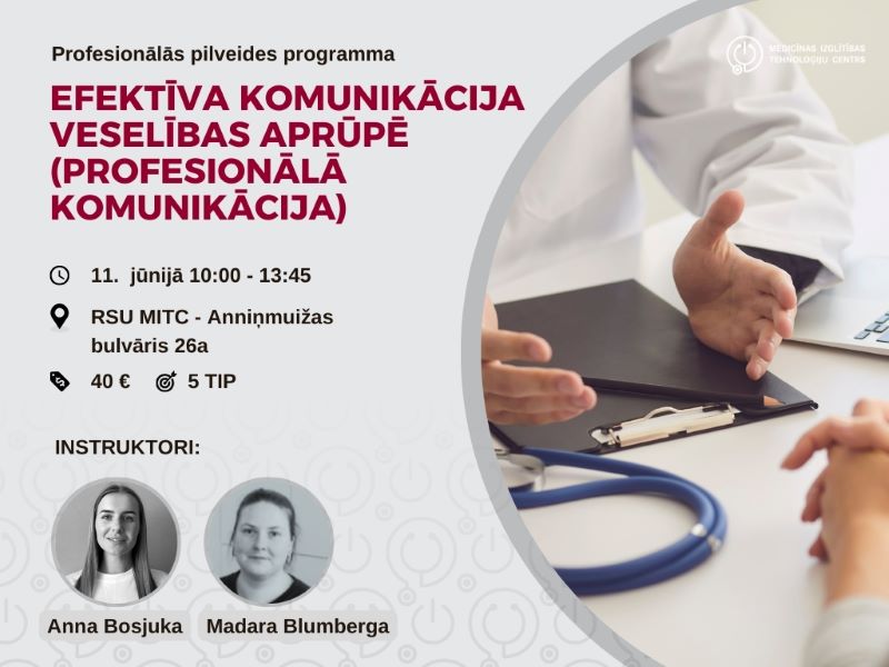 Mērķauditorija:māsas, ārsti, ārsta palīgiProgrammas apjoms:5 TIPDalības maksa:40 EURProgrammas vadītājas:Madara Blumberga, Ligija Vucāne, Diāna Grase, Anna BosjukaPieteiktiesNorises vietaTelpaRSU Medicīnas izglītības tehnoloģiju centrsDatums: 21.11.2025. Kontaktinformācija Pakalpojumu nodrošināšanas nodaļaE-pasts: kursi [at] rsu.lv Agnese DreimaneTālrunis: +37167409171E-pasts: agnese.dreimane [at] rsu.lv