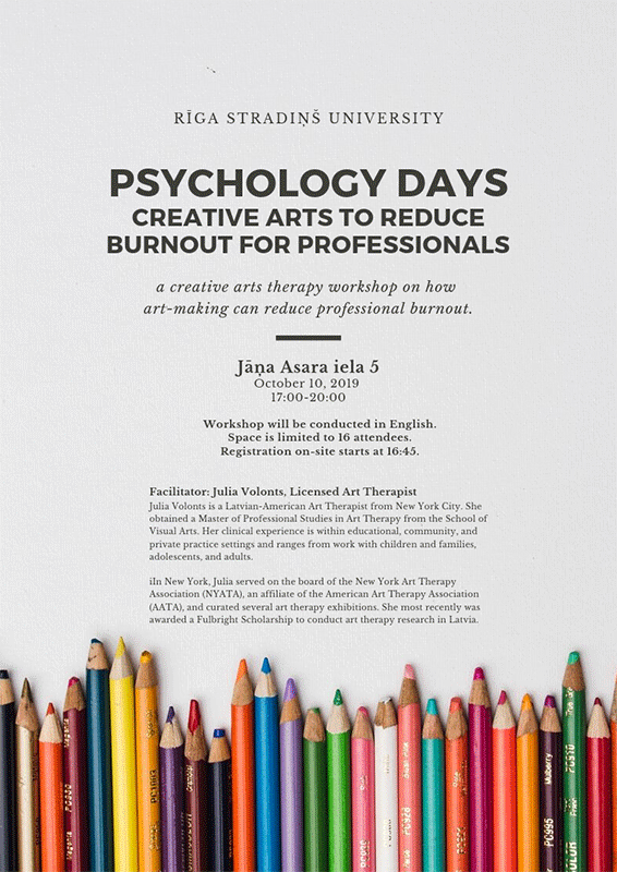 Psiholoģijas dienās 2019, kas norisināsies oktobrī, RSU piedāvās vairākus pasākumus. 10. oktobrī RSU Veselības psiholoģijas un pedagoģijas katedras telpās (J. Asara iela 5) notiks mākslas terapeites Jūlijas Volontas (Julia Volonts) meistarklase Creative activities to reduce burnout for professionals.