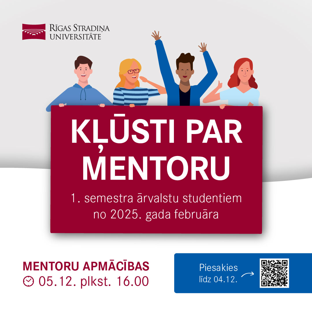 RSU Starptautisko sakaru departaments aicina studentus kļūt par mentoriem pirmā semestra ārvalstu studentiem no 2026. gada februāra.