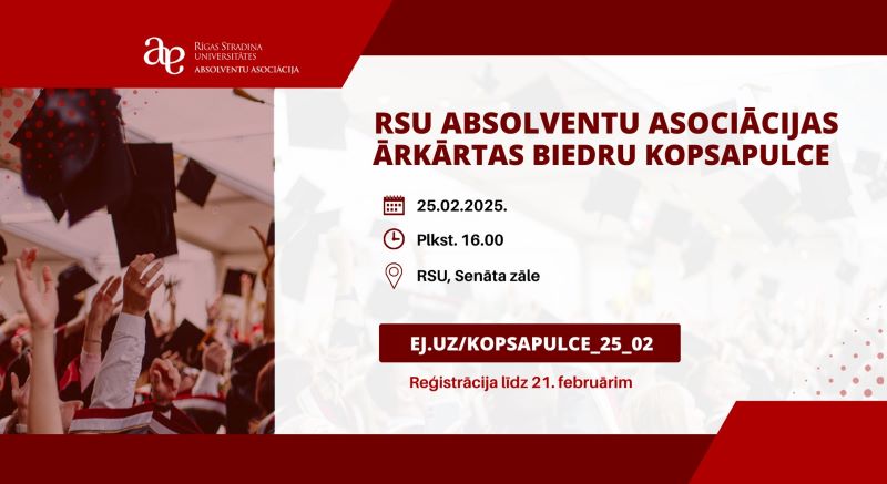RSU Absolventu asociācijas biedri aicināti piedalīties ārkārtas kopsapulcē otrdien, 25. februārī, plkst. 16.00 Senāta zālē.