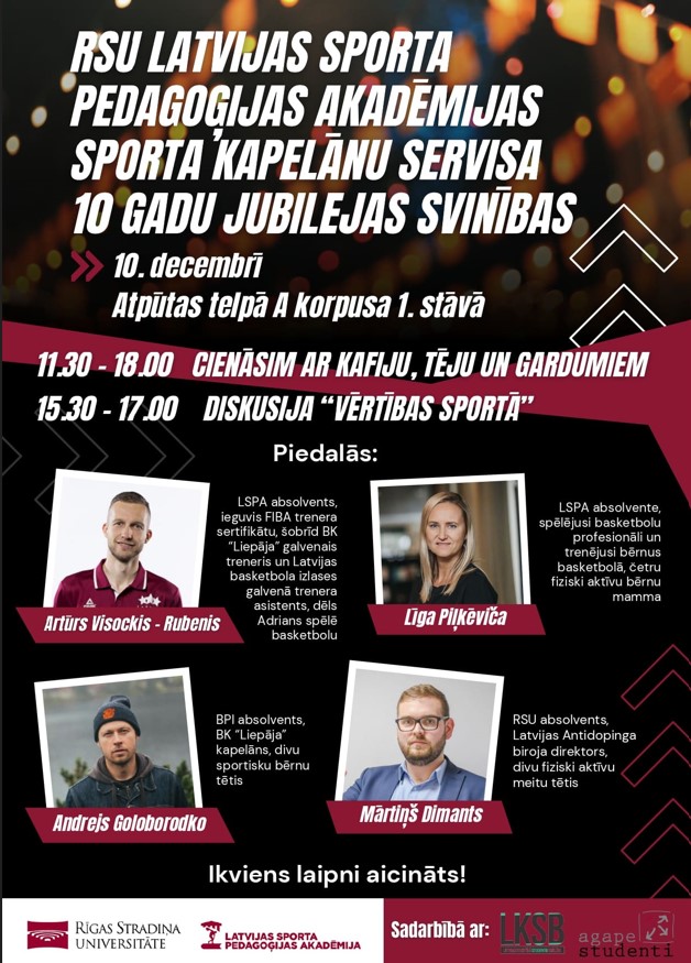 Otrdien, 10. decembrī, Rīgas Stradiņa Universitātes (RSU) Latvijas Sporta pedagoģijas akadēmijas (LSPA) telpās notiks Sporta kapelānu servisa 10 gadu jubilejas svinības. Aicinām visus interesentus piedalīties šajā notikumā, kas vienlaikus būs iespēja aizdomāties par vērtībām sportā un sabiedrībā kopumā.