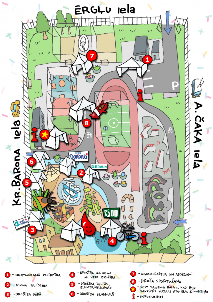 Astoņās interaktīvajās stacijās uzmanība tiks vērsta uz drošības pasākumiem, atpūšoties pie ūdeņiem vai uguns tuvumā, pavadot laiku uz ielas, pastaigājoties brīvā dabā vai vienkārši esot mājās, kā arī sportojot. Tiks atgādināts, kā pareizi izsaukt neatliekamo medicīnisko palīdzību, neapjukt krīzes situācijās un paziņot dispečeram visu nepieciešamo informāciju.