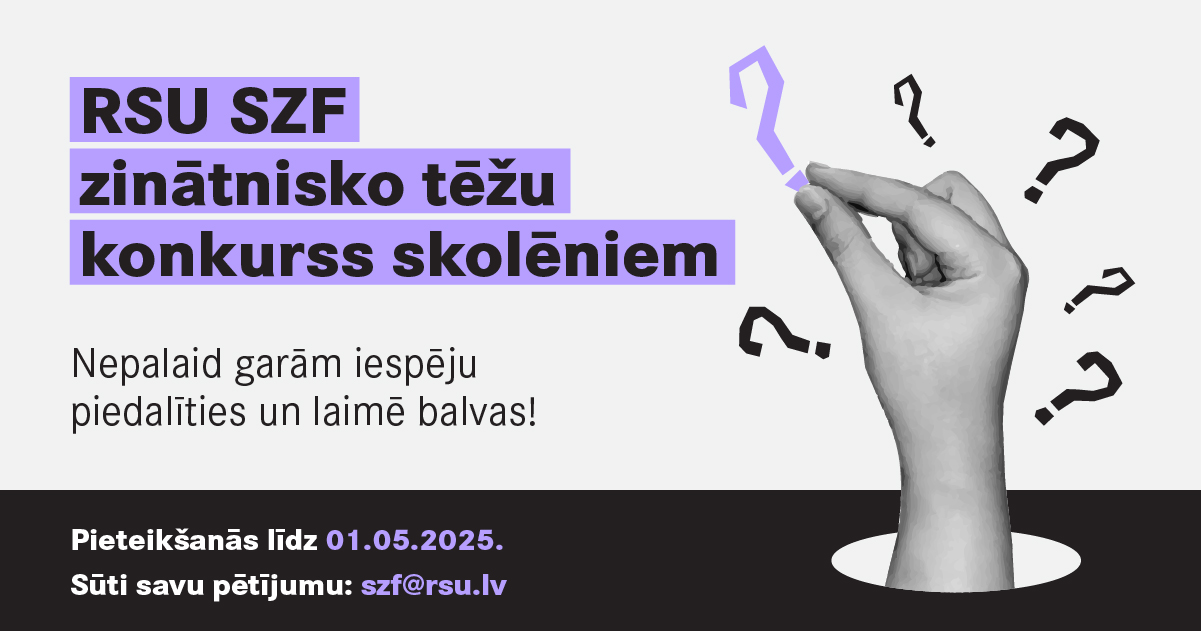 RSU SZF aicina vispārizglītojošo un profesionālo izglītības iestāžu skolēnus piedalīties zinātnisko tēžu konkursā! Dalībniekiem būs iespēja prezentēt savus pētījumus, saņemt ekspertu atsauksmes un sacensties par godalgotām vietām.