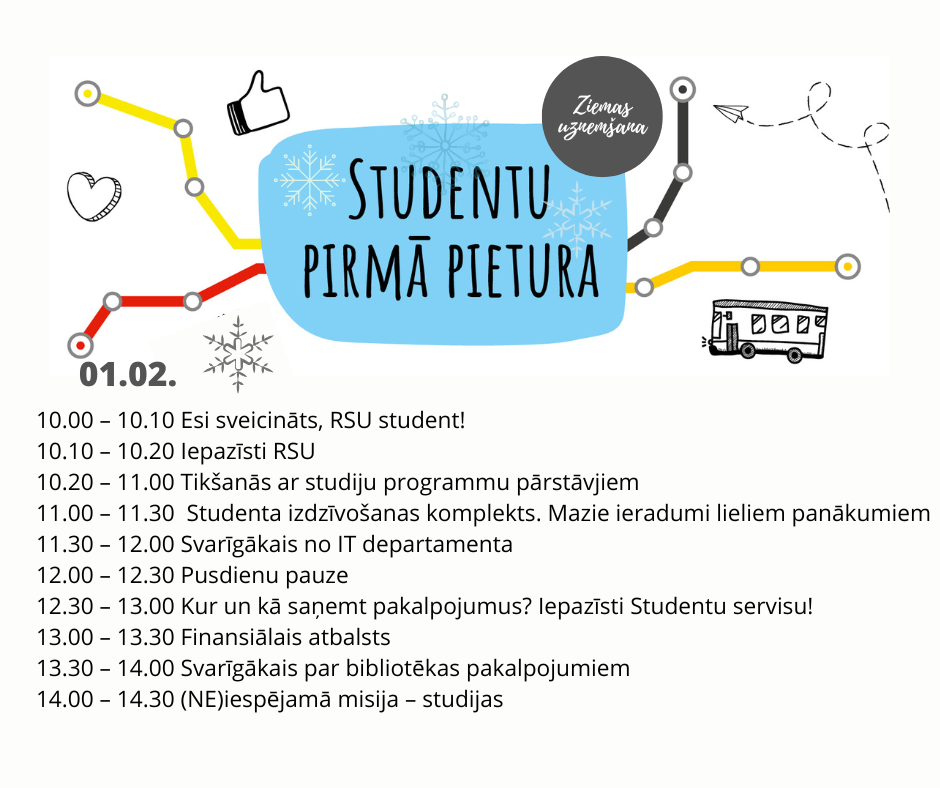 Pirmā kursa studenti aicināti piedalīties Studentu pirmās pieturas pasākumā tiešsaistē, kas ļaus iepazīt Rīgas Stradiņa universitāti pirms studiju sākuma.Reģistrēties Telpatiešsaistē, platformā ZoomDatums: 01.02.2025. Kontaktinformācija Karjeras atbalsta un labbūtības centrsTālrunis: +37167409140E-pasts: karjerascentrs [at] rsu.lv