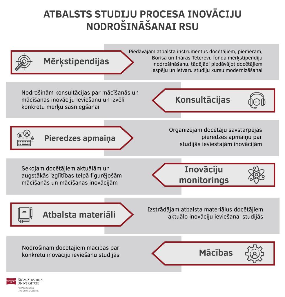 Balstoties RSU docētājiem būtiskajās tēmās un pedagoģijas inovāciju aktualitātēs, tiek izstrādāti pedagoģiskā atbalsta materiāli. Šajos materiālos tiek piedāvāts gan konceptuāls RSU pedagoģiskās filozofijas skaidrojums, gan metodiski ieteikumi, kas piedāvā praktiskus risinājumus docētāju darbam. Docētājiem iespējams saņemt konsultācijas par atbalsta materiālos aktualizētajām tēmām, kā arī citos studiju procesā aktuālos pedagoģijas jautājumos.