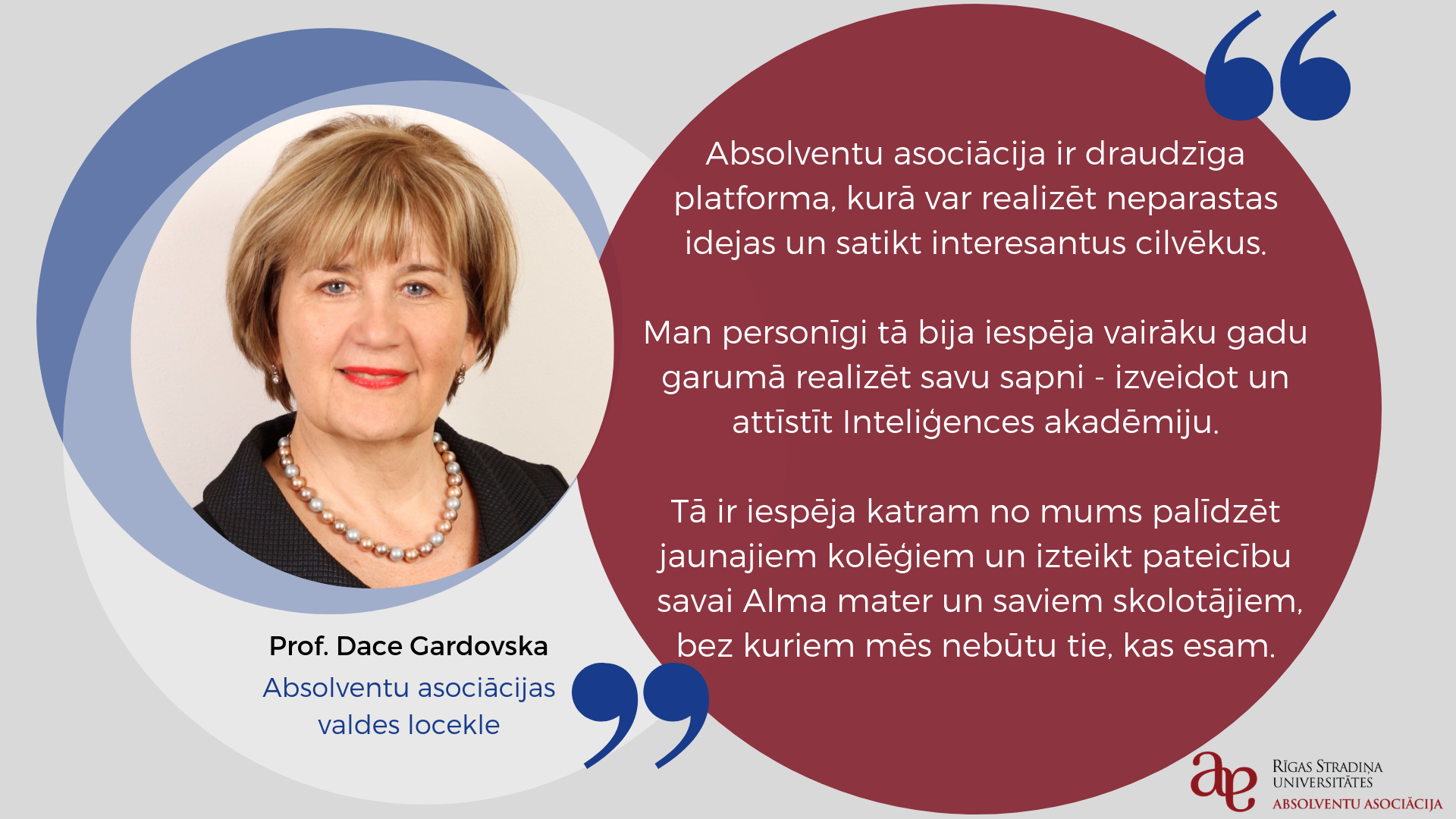 Absolventu asociācijas uzdevums ir veidot RSU absolventu kopību visa mūža garumā, atbalstīt viņu pastāvīgu saikni ar savu Alma mater. Mūsu augstskola katram no mums ieliek to stabilo pamatu, no kura atsperamies savai turpmākajai dzīvei. Absolventu asociācija padara jēgpilnu šo savstarpējo saikni, dodot cilvēkiem iespēju citam citu satikt, atrasties saziņā un darīt labas lietas savas universitātes un sabiedrības labā. Es aicinu visus RSU absolventus pievienoties Absolventu asociācijai!