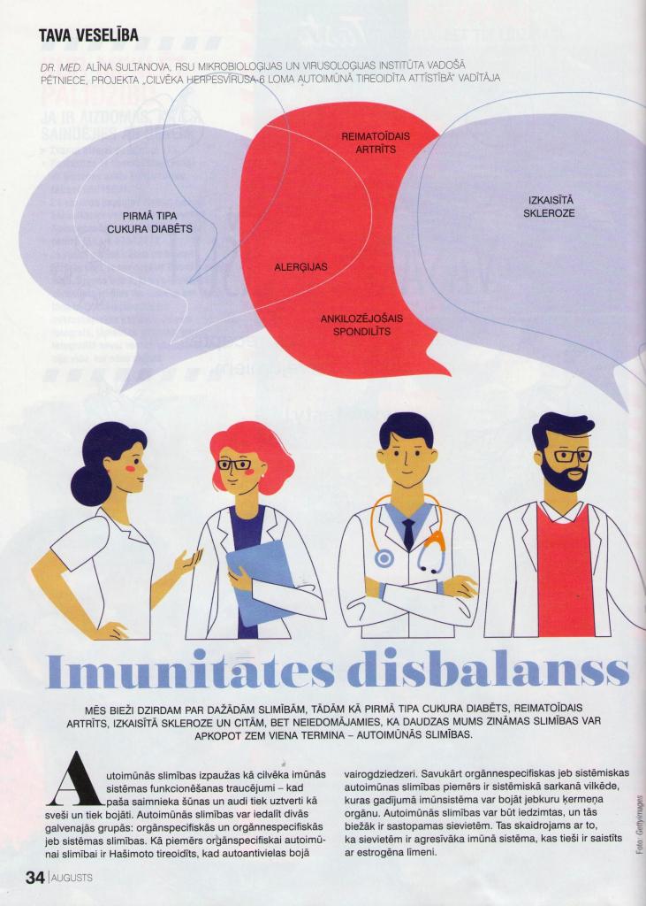 Žurnāla Veselība 2019. gada augusta numurā publicēts pēcdoktorantes Alīnas Sultanovas raksts Imunitātes disbalanss.