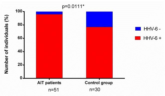 1. attēls. AIT pacientu un kontroles grupas HHV-6 genoma sekvences klātbūtne