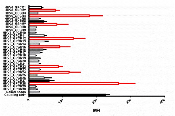 Rezultātā 8 sintētiskie peptīdi uzrādīja saistīšanos ar IgG un IgM klases antivielām AIT pacientu un kontroles grupas plazmas paraugos. Diviem sintētiskiem peptīdiem detektēja specifisku IgG antivielu saistīšanās, taču signāls bija vājš, kas liecina, ka AIT pacientu un asins donoru perifērajās asinīs šo antivielu daudzums bija neliels. Tomēr visi astoņi sintētiskie peptīdi, kuri spēja saistīties ar IgM antivielām, to specifiskā saistīšanās deva spēcīgu signālu, kas parādīja IgM klases antivielu dominanci pret izveidotajiem peptīdiem. Tas norāda, ka HHV-6 inficētie indivīdi producē specifiskas antivielas pret vīrusa hemokīnu receptoriem, un IgM klases antivielu dominance varētu norādīt uz patstāvīgu HHV-6 reaktivāciju un šo proteīnu ekspresiju uz saimniekorganisma šūnu virsmas.