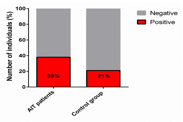 72 autoimūnā tireoidīta pacientu un 38 kontroles grupas indivīdu perifēro asiņu plazmas paraugi tika pārbaudīti uz antivielām pret herpesvīrusa -6 olbaltumvielu fragmentiem (2. att.). Rezultāti uzrādīja, ka 28 no 72 AIT pacientu plazmas paraugi un 8 no 38 kontroles grupas indivīdu plazmas paraugi uzrādīja antivielu klātbūtni pret vīrusa olbaltumvielu fragmentiem (3. att.).