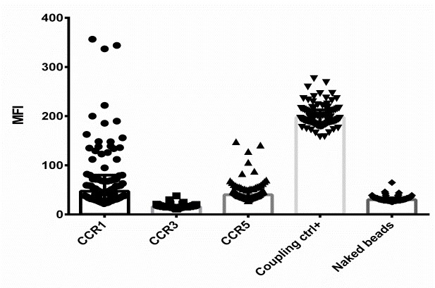 Visiem sintētiskajiem peptīdiem un 3 rekombinantajiem proteīniem (CCR1, CCR3 un CCR5) tika pārbaudīta tiem specifisko IgG un IgM klātbūtne 62 AIT pacientu un 32 kontroles grupas plazmas paraugos. Sintētiskie peptīdi ar augstākajiem imunogenitātes rezultātiem tika izmantoti antivielu eluēšanai, lai pārliecinātos par specifisku antivielu saistīšanos. Eluētās antivielas tika stabilizētas un izmantotas krusteniskās reaktivitātes testā ar cilvēka rekombinantajiem CCR proteīniem.
