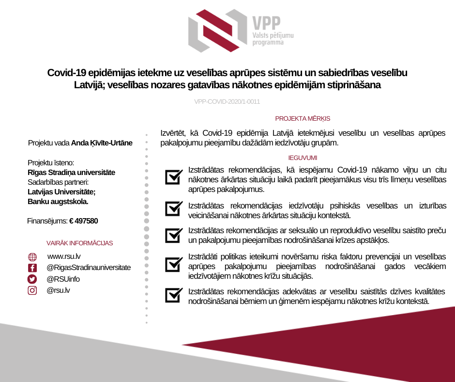 Lai veicinātu Latvijas veselības aprūpes un sabiedrības veselības sistēmu gatavību nākotnes epidēmijām un ārkārtas stāvokļiem, mācoties no pieredzes, kas iegūta COVID-19 epidēmijas laikā, tiks veikti epidemioloģiskie un sabiedrības veselības pētījumi par pēcepidēmijas sekām, tostarp psihosociālajiem un uzvedības aspektiem vispārējā populācijā un noteiktās iedzīvotāju grupās (bērni, reproduktīvā vecuma cilvēki, vecāka gadagājuma cilvēki), kā arī tiks analizēta veselības aprūpes pakalpojumu nepārtrauktība un esošo veselības aprūpes pakalpojumu algoritmi. Šā projekta rezultāti palīdzēs attīstīt ilgtspējīgu pieeju būtisku veselības aprūpes un sabiedrības veselības pakalpojumu sniegšanai pašreizējās COVID-19 epidēmijas un iespējamo nākotnes apdraudējumu laikā, atbalstot LR Veselības ministriju un citas atbildīgās institūcijas atbilstīgu aktivitāšu situācijas pārvaldībai plānošanā.
