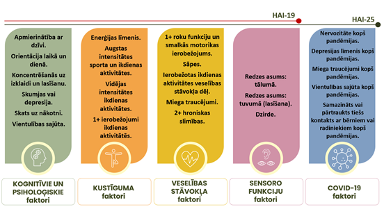Atbilstoši faktoranalīzei tika izstrādātas divas indeksa versijas – neiekļaujot ar Covid-19 pandēmiju saistītos faktorus (HAI-19) un iekļaujot ar Covid-19 pandēmiju saistītos faktorus (HAI-25). Informācija par indeksā iesaistītajiem faktoriem apkopota 3. attēlā.